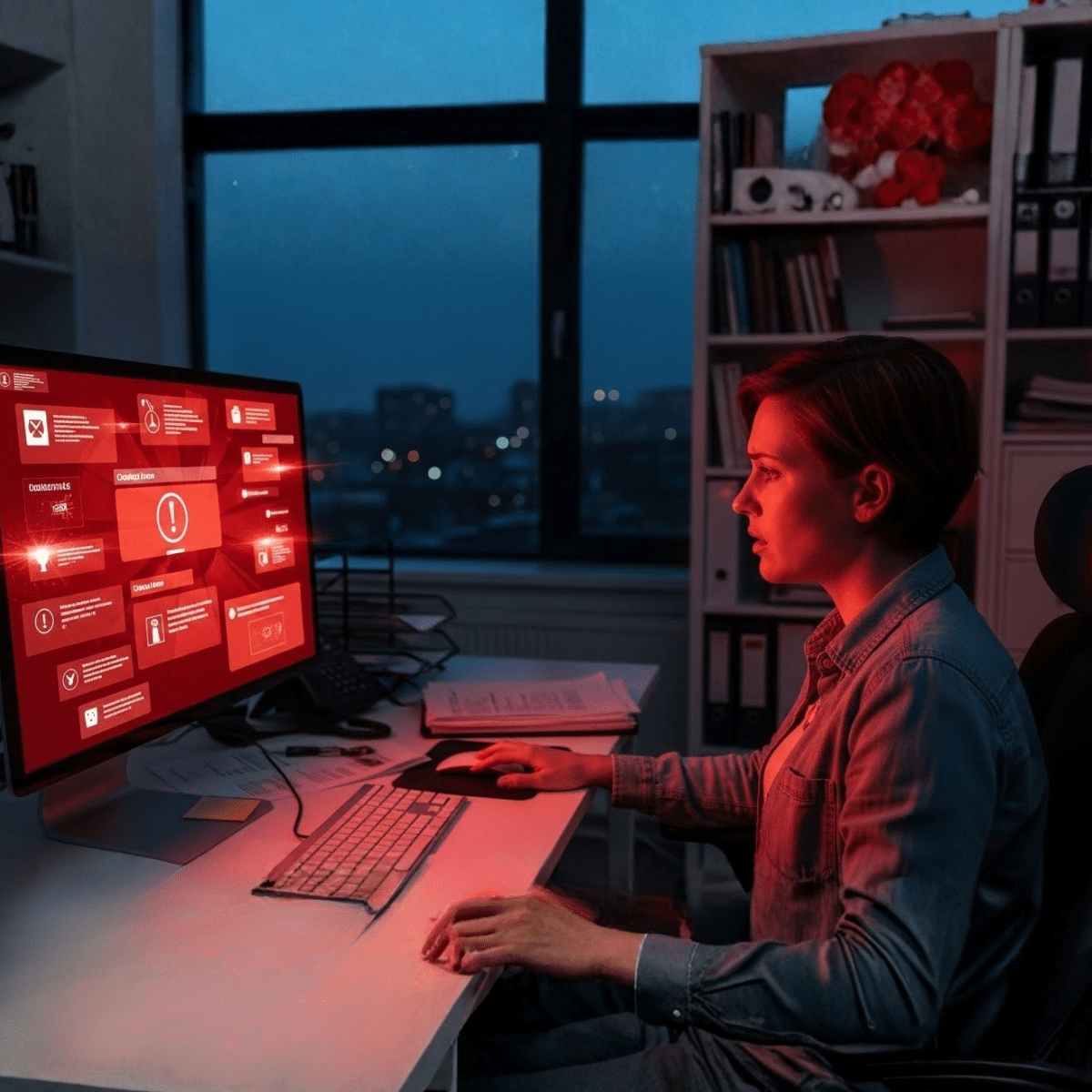 imagem com fundo preto e telas com alertas em vermelho